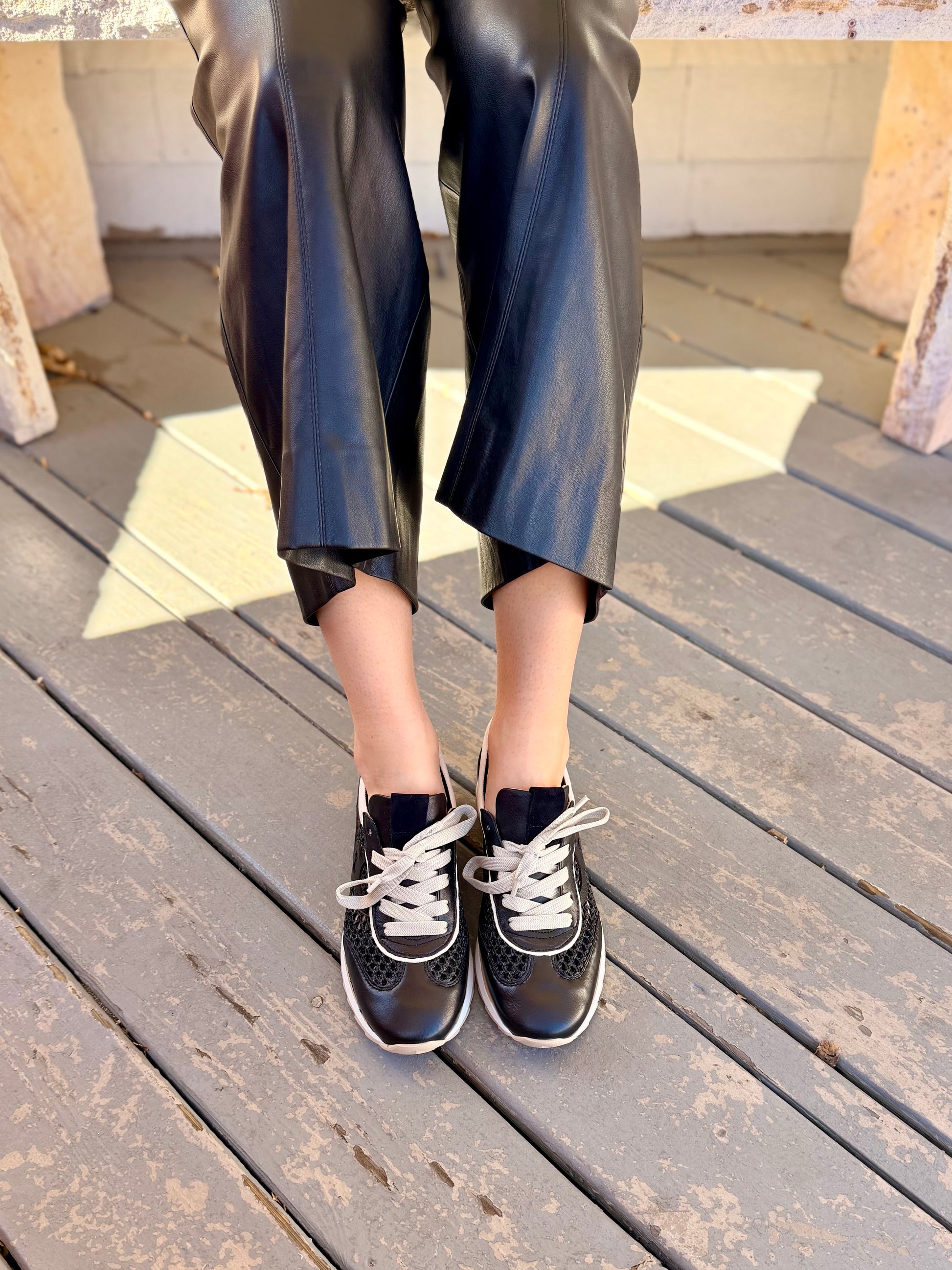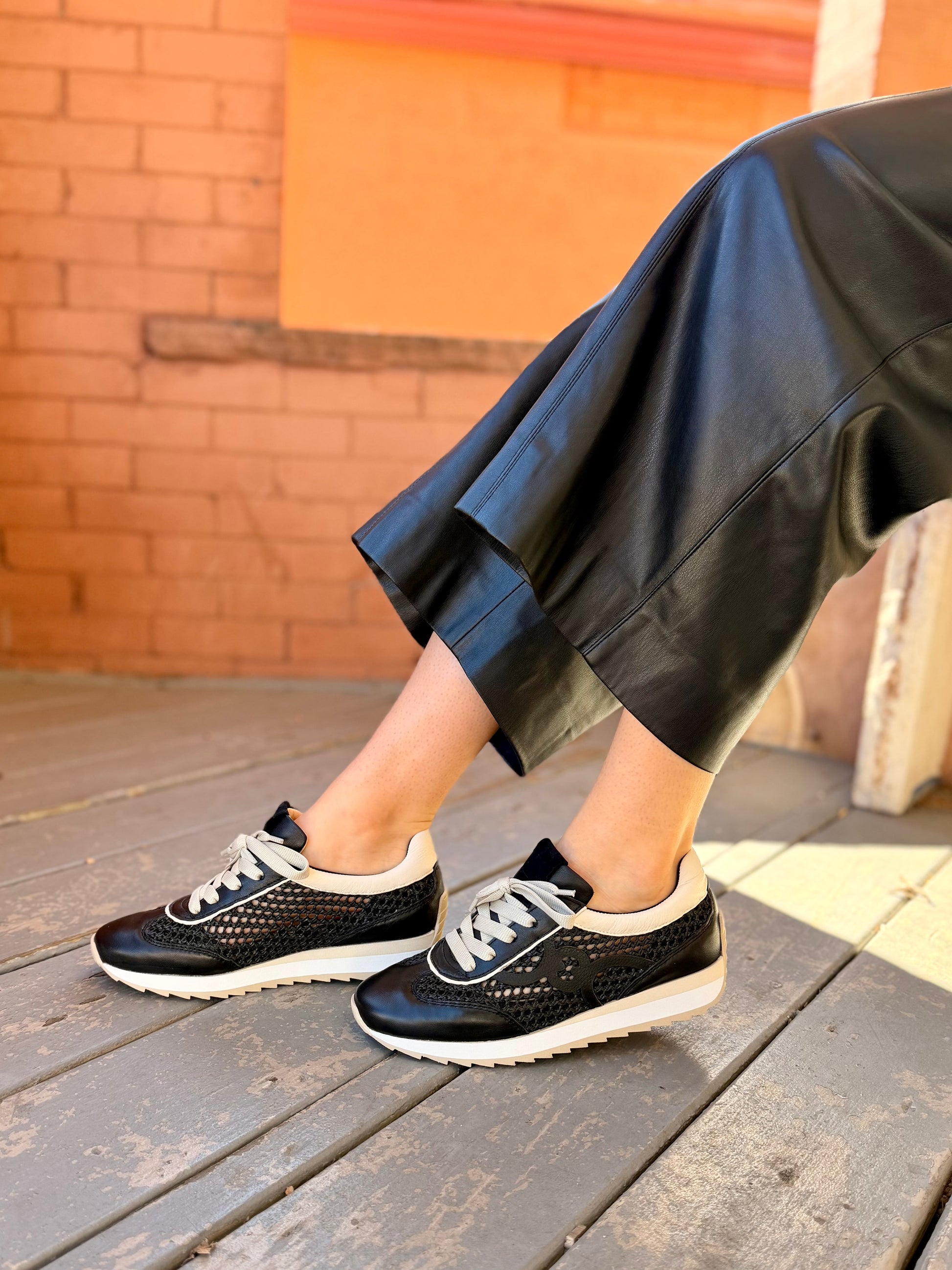 - Leather and woven upper