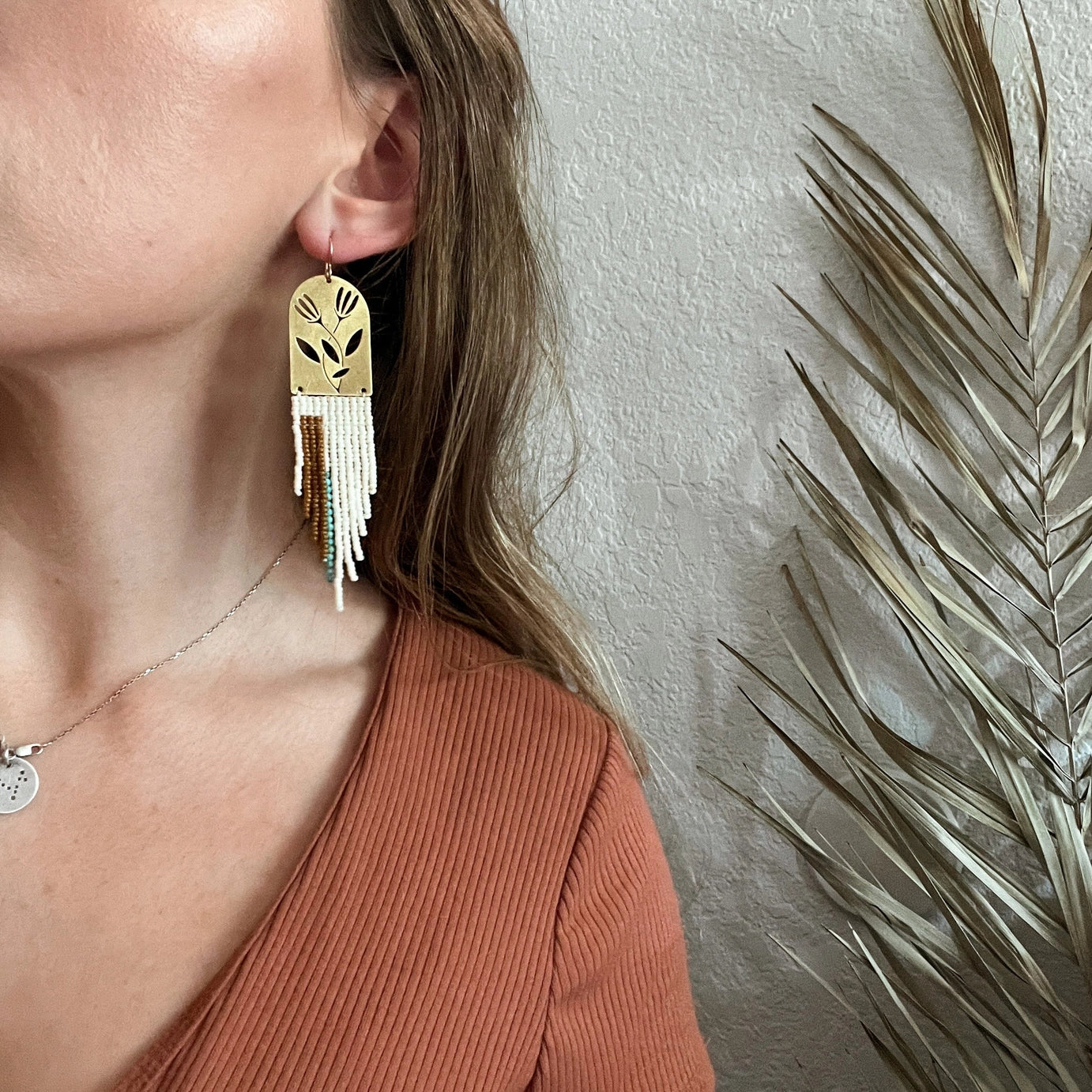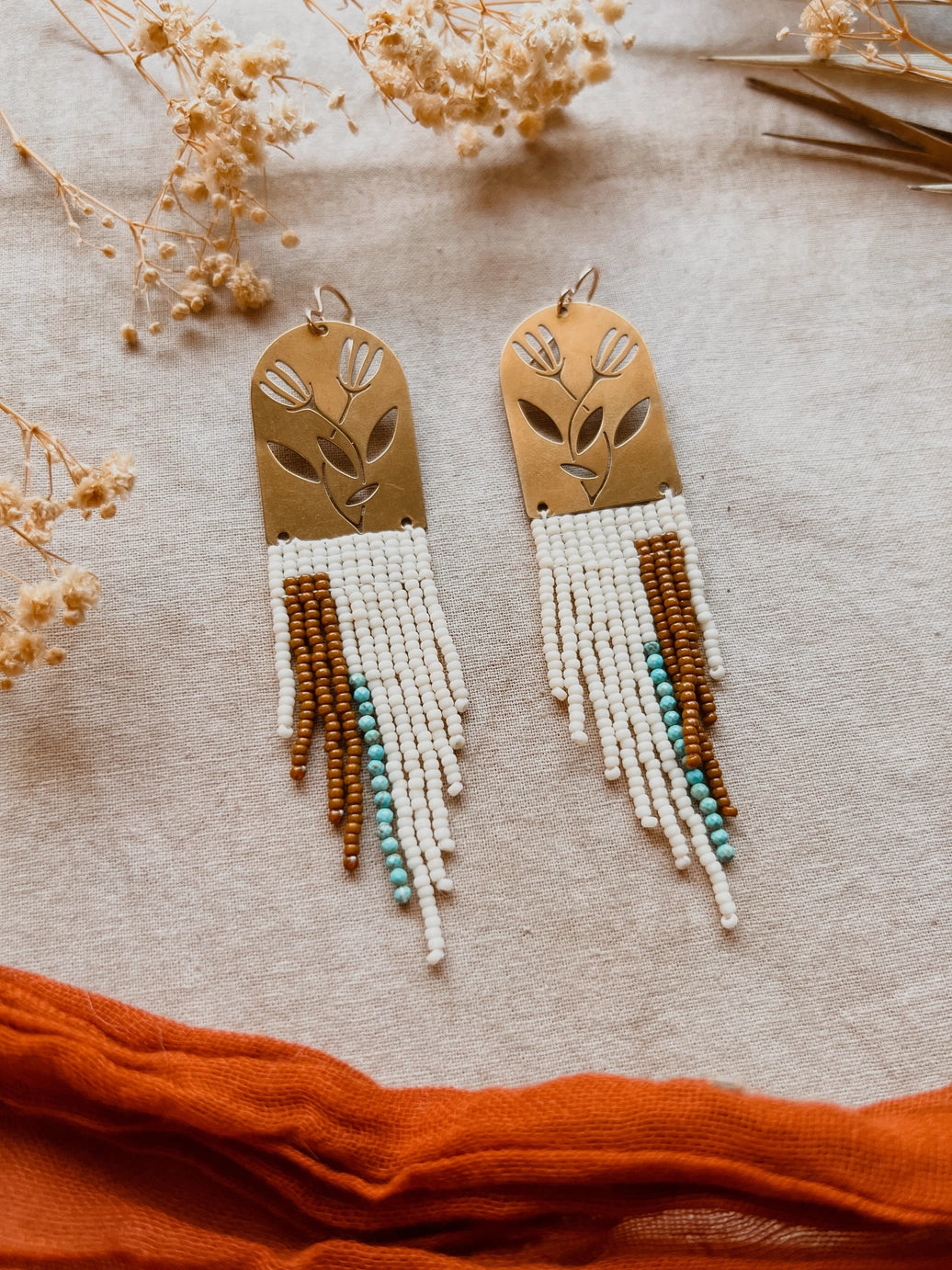 - Handwoven earrings with Japanese glass seed beads and floral brass frame